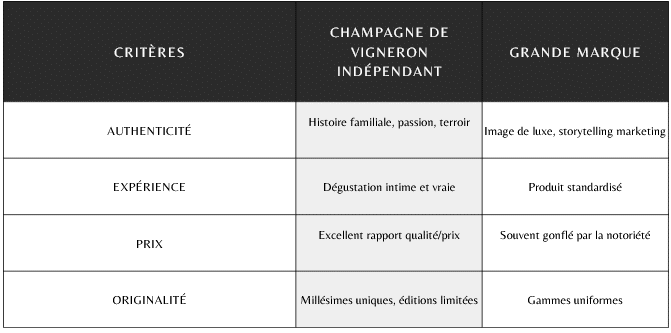 Un champagne de vigneron indépendant met en avant le terroir, l’authenticité et un savoir-faire familial. Une grande marque propose un produit plus standardisé, souvent plus cher car lié à son image.